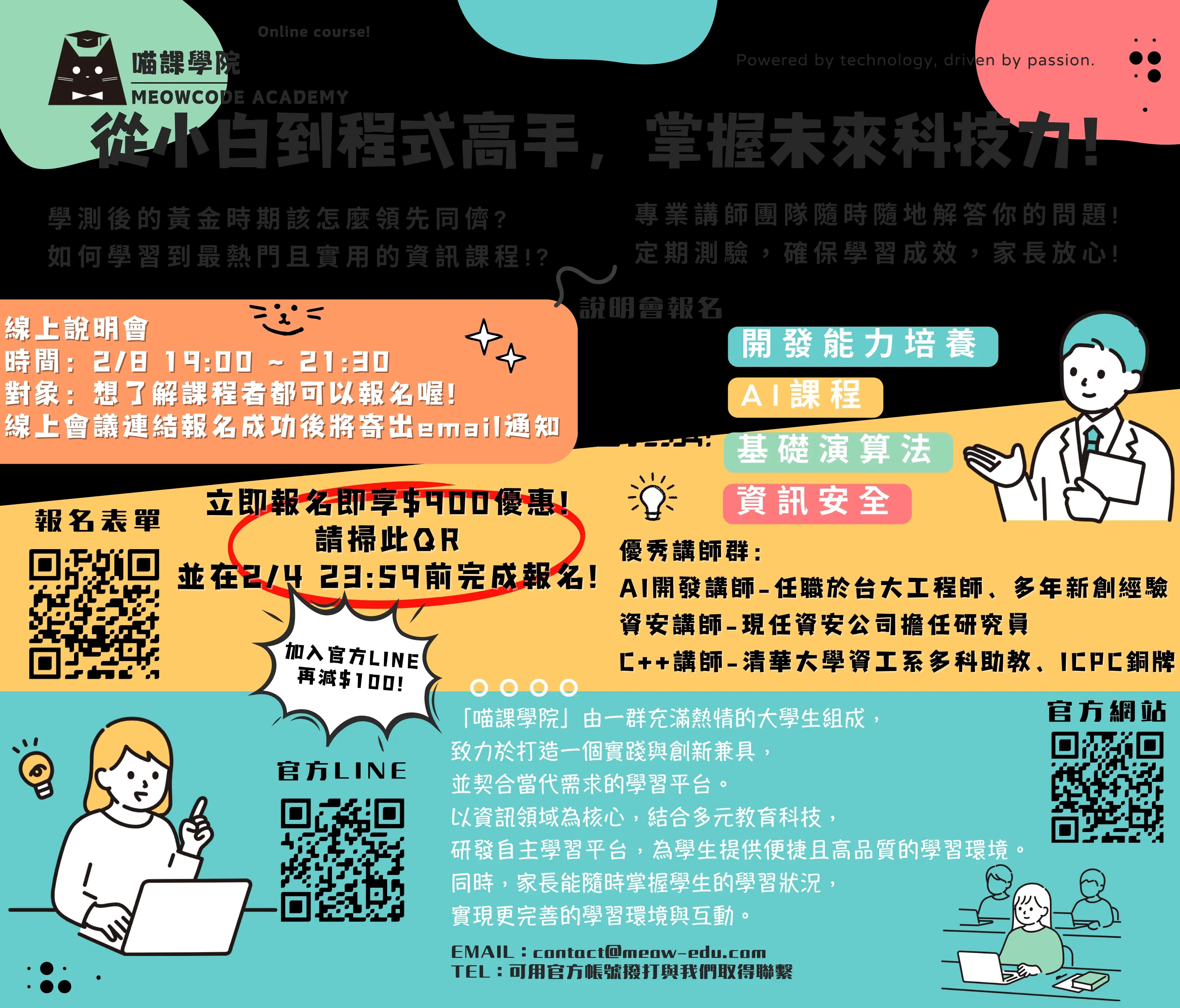 - C++ 語法班、Python 語法班、資安班:一堂 NT$ 1,000、整期報名 NT$ 12,000
